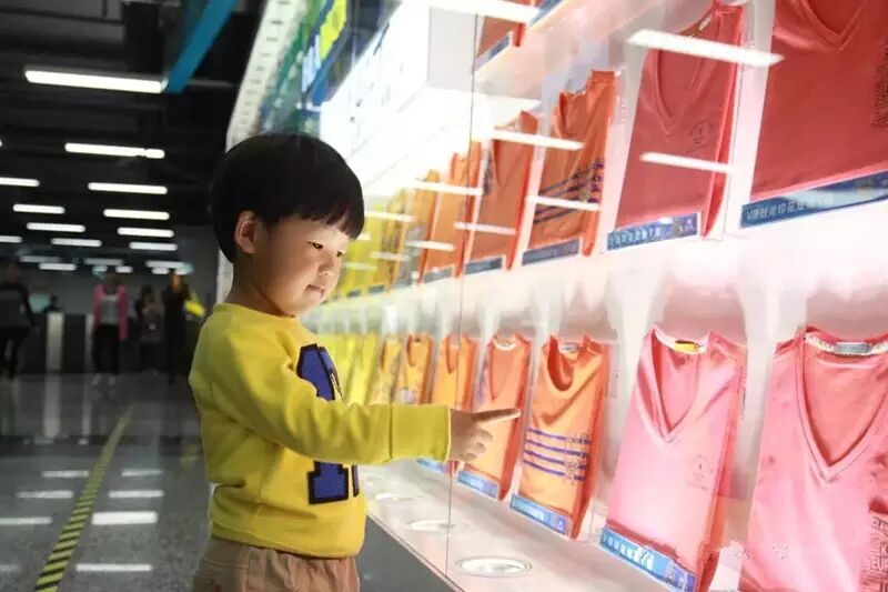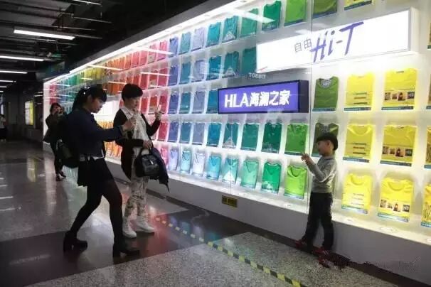 从地铁闸机进口远远望去,这面巨大的墙体霓彩缤纷,非常创意地选用了渐变的彩虹色,立时在地铁站格局单调、颜色单一的空间中成为焦点所在,不仅成功为沉闷的地铁站注入新鲜活力,也如一道彩虹带给了行人雨后初晴般的好心情。走近一看,才发现,这面巨大的彩虹墙竟然由一件件T恤拼图而成,数百件T恤本身的色彩共同构成了这面巨大吸睛的彩虹墙体,着实让人惊叹。据施工方介绍,这面Hi-T彩虹墙全长近35米,共排列有404件海澜之家2015最新款“Hi-T”,所有T恤选用精致的亚克力底托在墙面悬空固定,极具品质感的呈现着海澜之家T恤产品的色彩图案,也让行人不由为这样的展示创意点赞。